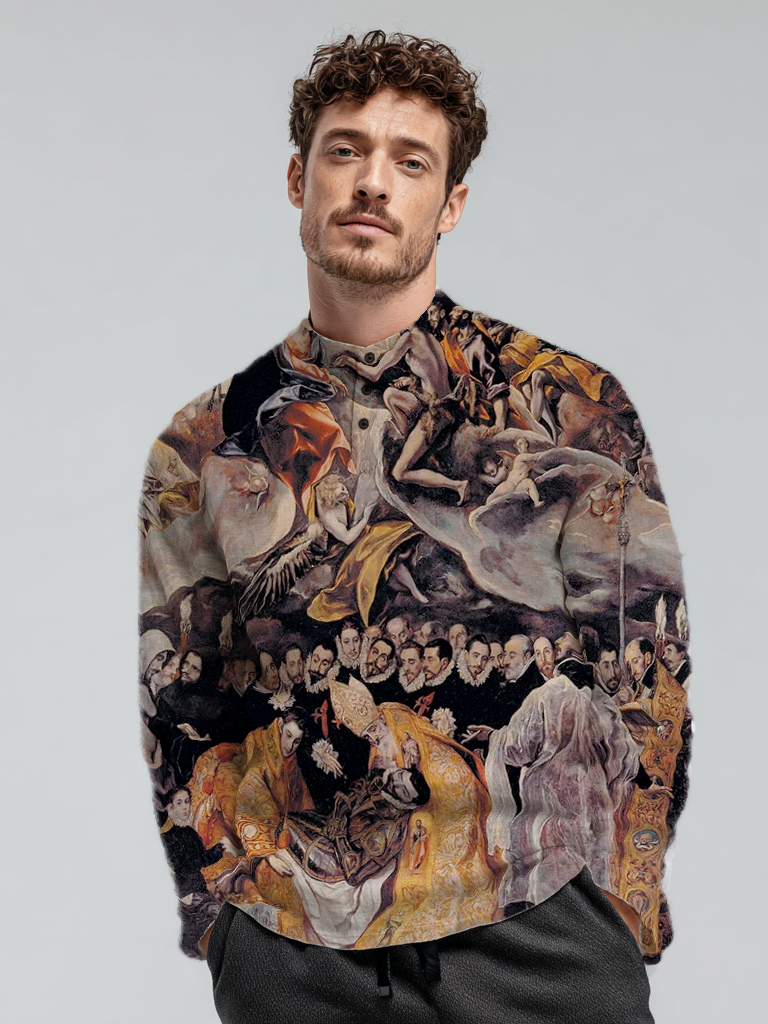 Men's linen printed long-sleeved pullover stand-up collar top